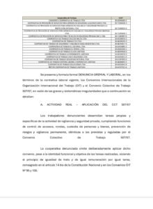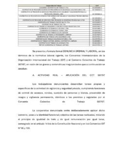 Según consta en la denuncia, las cooperativas denunciadas no funcionan bajo los principios del cooperativismo genuino. Por el contrario, imponen una falsa figura asociativa a trabajadores que cumplen tareas idénticas a las de cualquier empleado de seguridad privada en relación de dependencia.