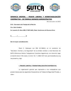 La presentación fue realizada ante el MINISTERIO DE CAPITAL HUMANO y el INAES, marcando un precedente histórico en la actividad. Se trata de la primera denuncia integral que aborda el fenómeno de las cooperativas de seguridad como lo que realmente son: una estafa laboral organizada, utilizada para abaratar costos a expensas de los derechos básicos de los vigiladores.